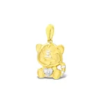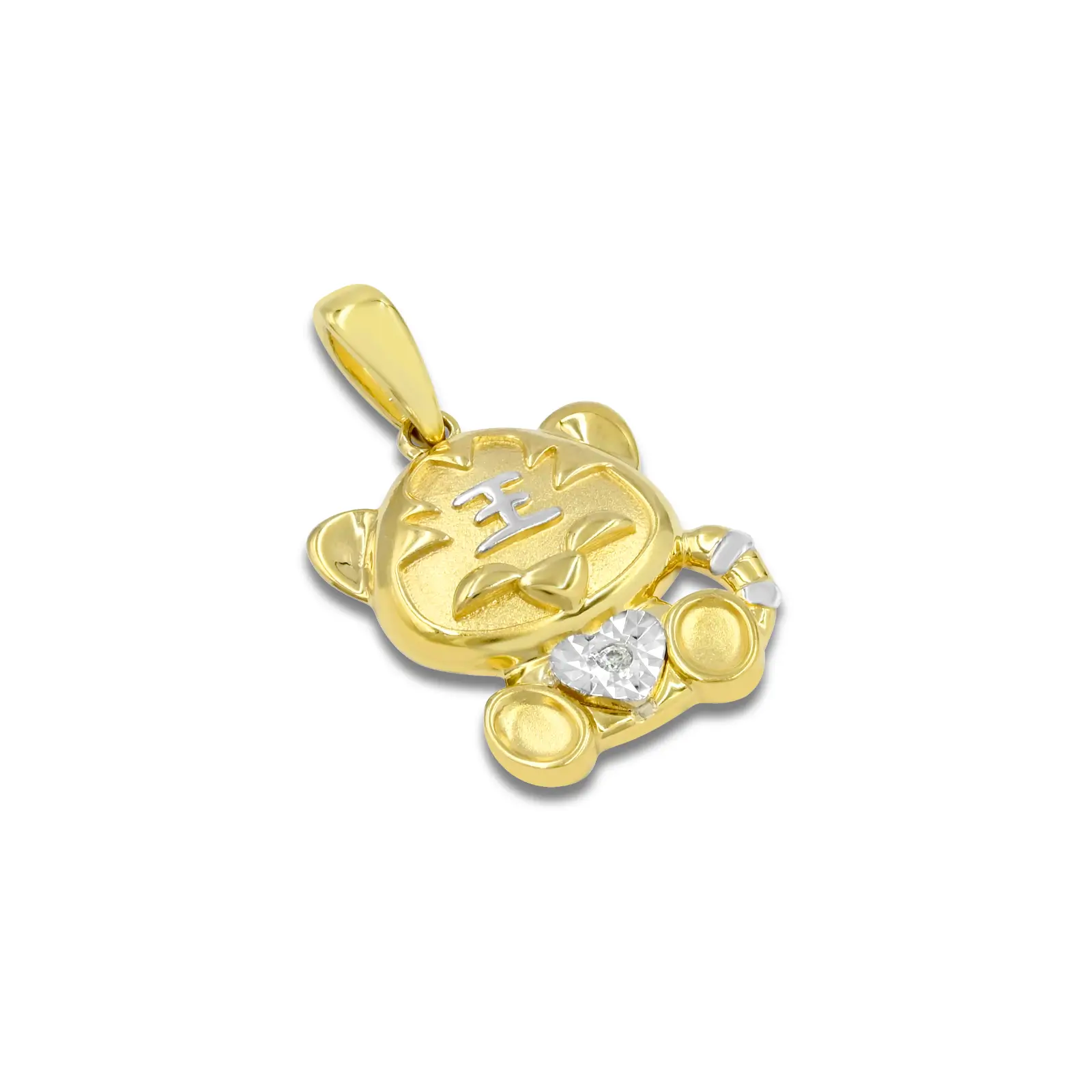 Strong is our Courageous Tiger Rawr Diamond Pendant. Number 3 in the race this yellow gold carnivore sports white gold on its stripes and the character for king on its forehead. Its heart is shown as a heart-shaped diamond. All of this craftsmanship results in a force to be reckoned with.